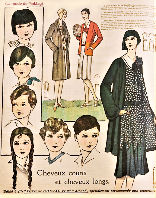 Απο το περιοδικό Le Petit Echo de la Mode 08/1929, παίρνουμε τα σκίτσα για χτενίσματα μικρών κοριτσιών. Η μεγαλύτερη τάση της μόδας για τις ενήλικες γυναίκες ήταν το πολύ-πολύ κοντό καρέ που δεν άφηνε ούτε ένα πόντο μήκος στον αυχένα, μετά την ρίζα των χαμηλά τοποθετημένων τριχών. Σε σπάνιες περιπτώσεις οι γυναίκες διατηρούσαν τα μαλλιά τους σε κοτσίδες που τις τύλιγαν γύρω από τα αυτιά τους και πάντως κοντά στο κεφάλι τους, όχι ελεύθερες.