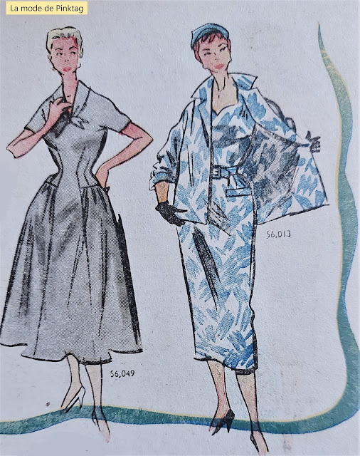 Μοντέλα για την Άνοιξη από το περιοδικό Echo de la Mode Μαρτίου 1955. Αριστερά το κοντομάνικο φόρεμα σε γκρι μάλλινο με την φαρδιά φούστα, δεξιά το παστέλ σατέν σύνολο με στενό φόρεμα και ριχτή κοντή ζακέτα σε αφηρημένο ντεσέν. Κάτι για όλες τις σιλουέτες κι όλα τα γούστα.